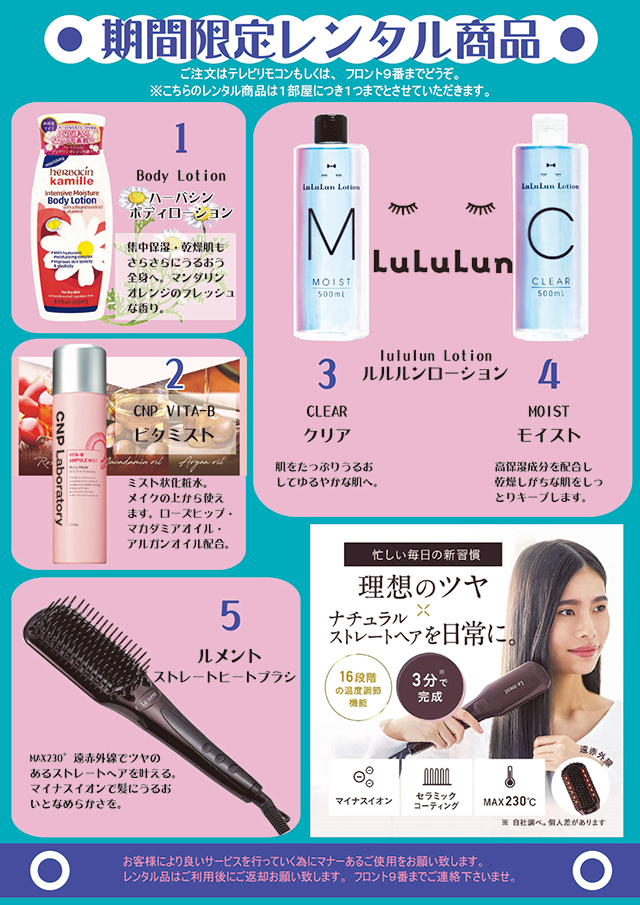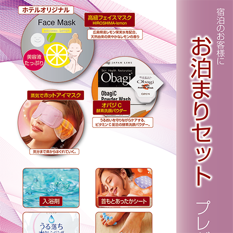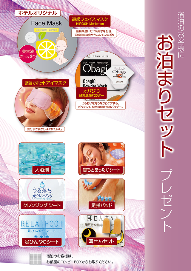 宿泊のお客様に「お泊まりセット」プレゼント中です。
