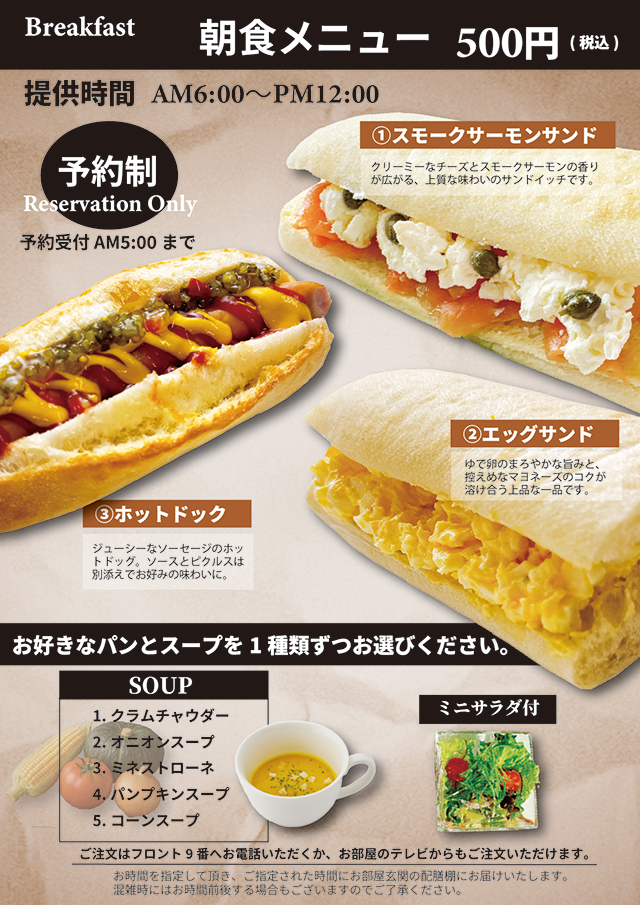 宿泊のお客様は、お得な朝食メニューがご注文できます。